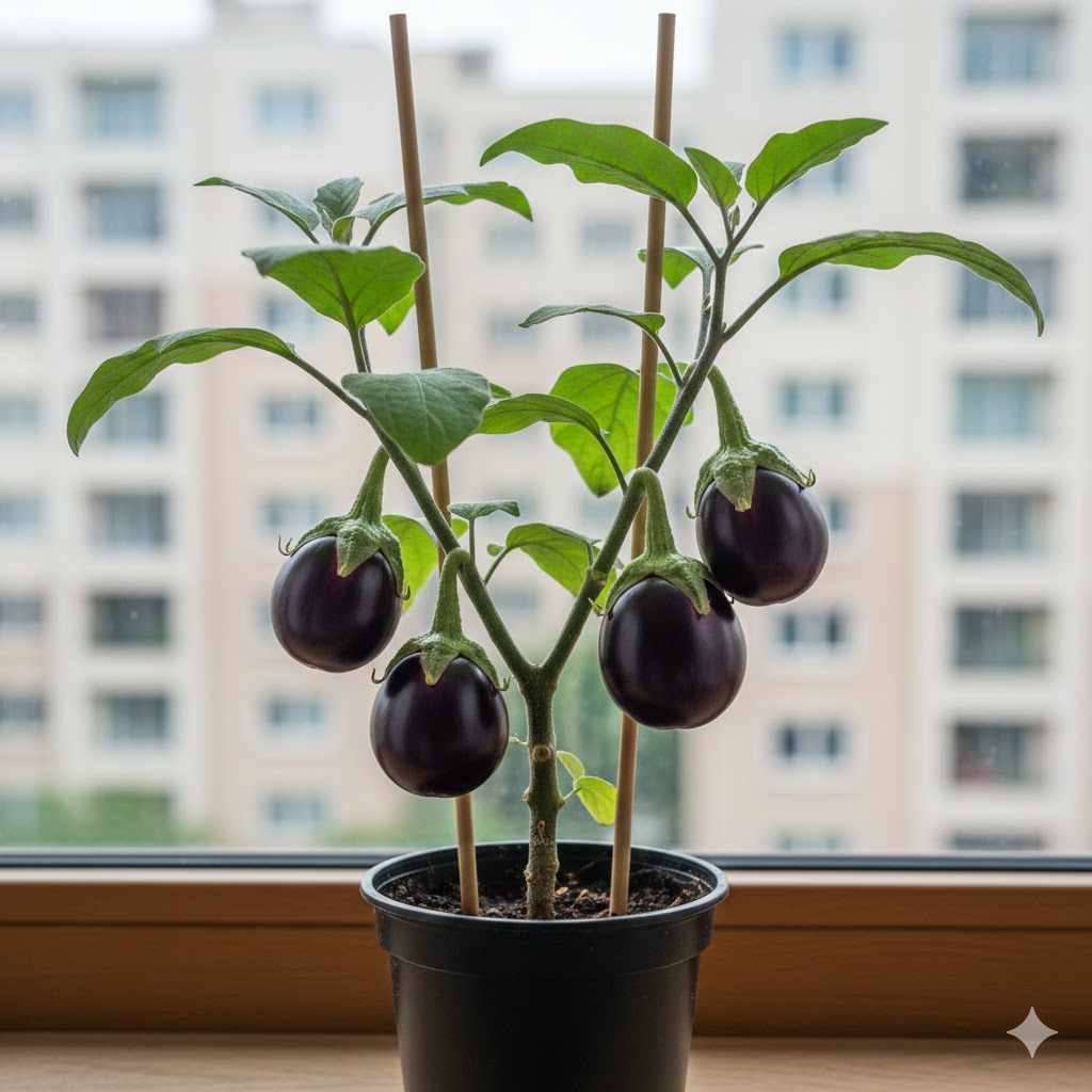 Перші міні-баклажани з’являються вже через 21 день, а далі нові партії фіолетових плодів визрівають кожні 30–40 днів.