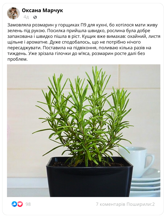 Вічнозелений розмарин у професійних горщиках П9 — це повністю готове рішення для вашої кухні чи балкону, яке не потребує пересадок. Достатньо просто дістати з горщик посилки, поставити на світле підвіконня та поливати 2–3 рази на тиждень.