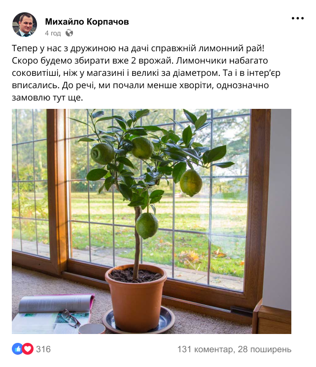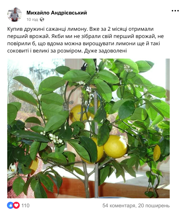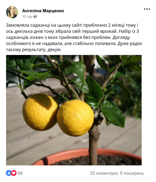 Приблизно рік тому я придбав саджанці лимонного дерева. Був взагалі в шоці, що їх можна вирощувати вдома! Мені все детально розказали, як правильно посадити і доглядати. І ось, після такого успішного врожаю (за рік зібрав десь 8-10 кг лимонів) вирішив оптом замовити тут саджанці, вирощувати і продавати! І не тільки саджанці лимону, а ще й банану, мандаринів і ківі! Тепер на пенсії займаюсь улюбленою справою!