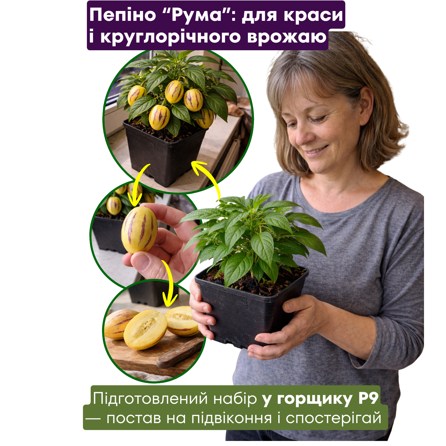 Пепіно «Рума» — це сучасний кімнатний сорт, спеціально підібраний для вирощування в обмеженому просторі. Рослина добре почувається у горщиках, стабільно росте в умовах квартири та не потребує теплиці чи відкритого ґрунту. Завдяки компактній формі «Рума» підходить для підвіконь, засклених балконів і лоджій.
