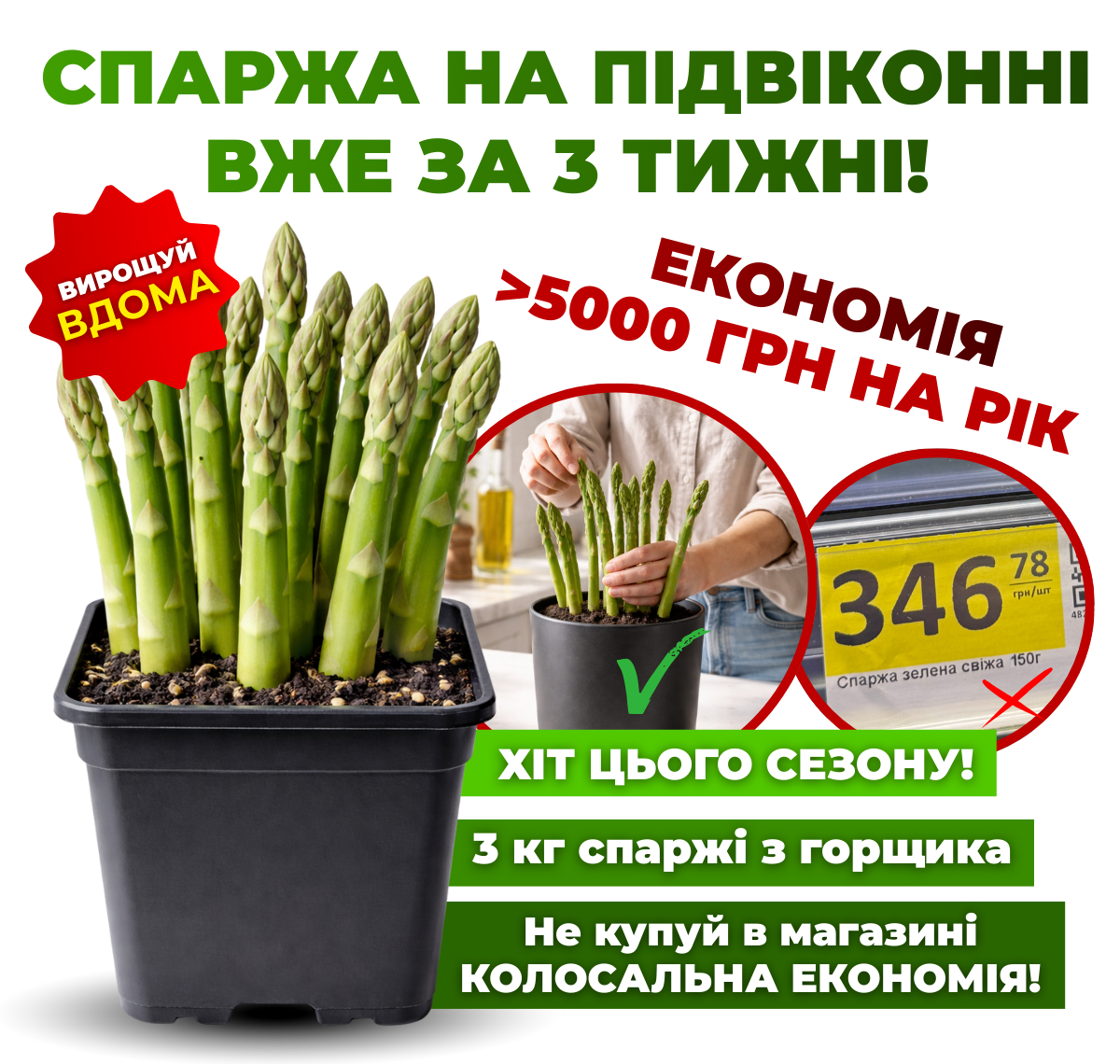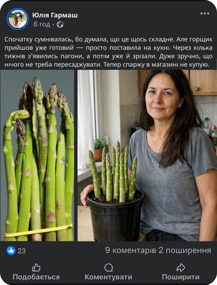 У магазині спаржа коштує дорого і купується щоразу заново. В середньому 150–300 грн за пучок, і за рік регулярних покупок сума легко доходить до кількох тисяч гривень. Горщик Р9 — це разова інвестиція, яка окупається вже за перший сезон, а далі ви просто зрізаєте свою спаржу без постійних витрат.
