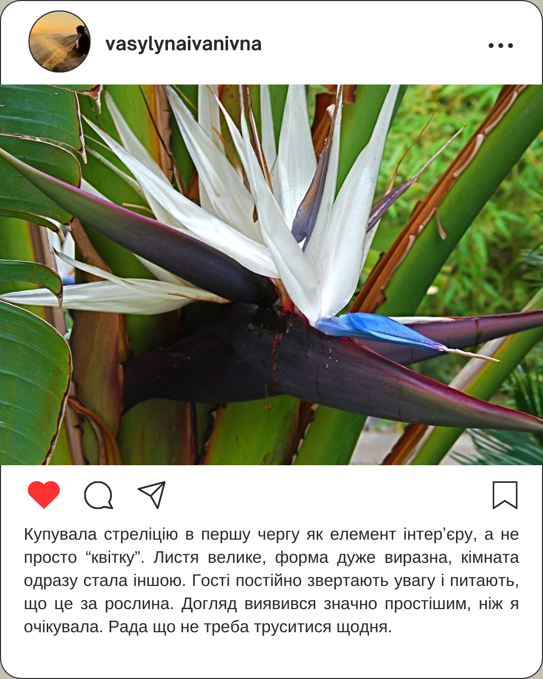 Стреліція — ефектна екзотична рослина для квартири, яку цінують за великі виразні листки та унікальні квіти.