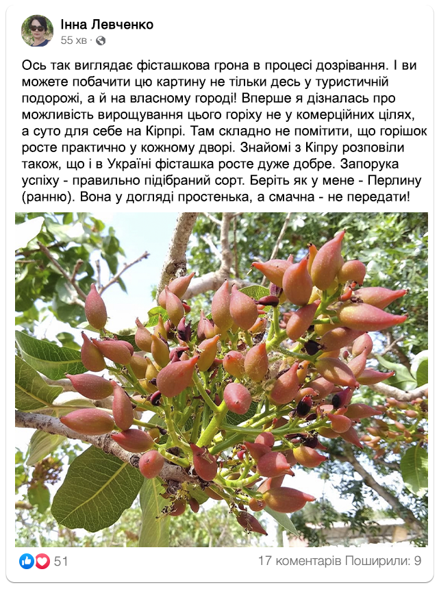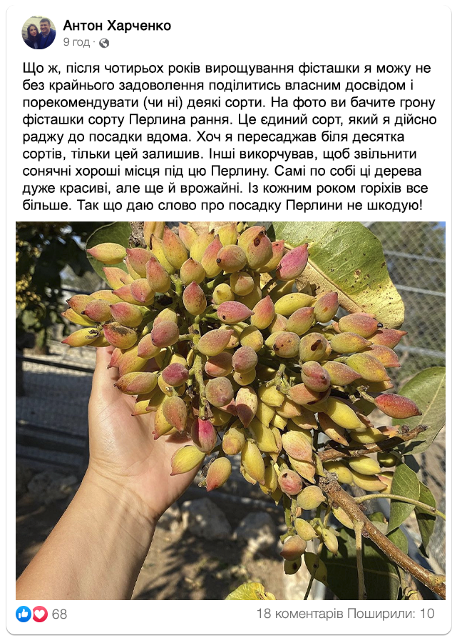 «Перлина рання» – високоврожайний та найбільший за розміром сорт фісташок, створений агрономами розплідника «Золотий Горішок» Валентиною та Михайлом Турченко.